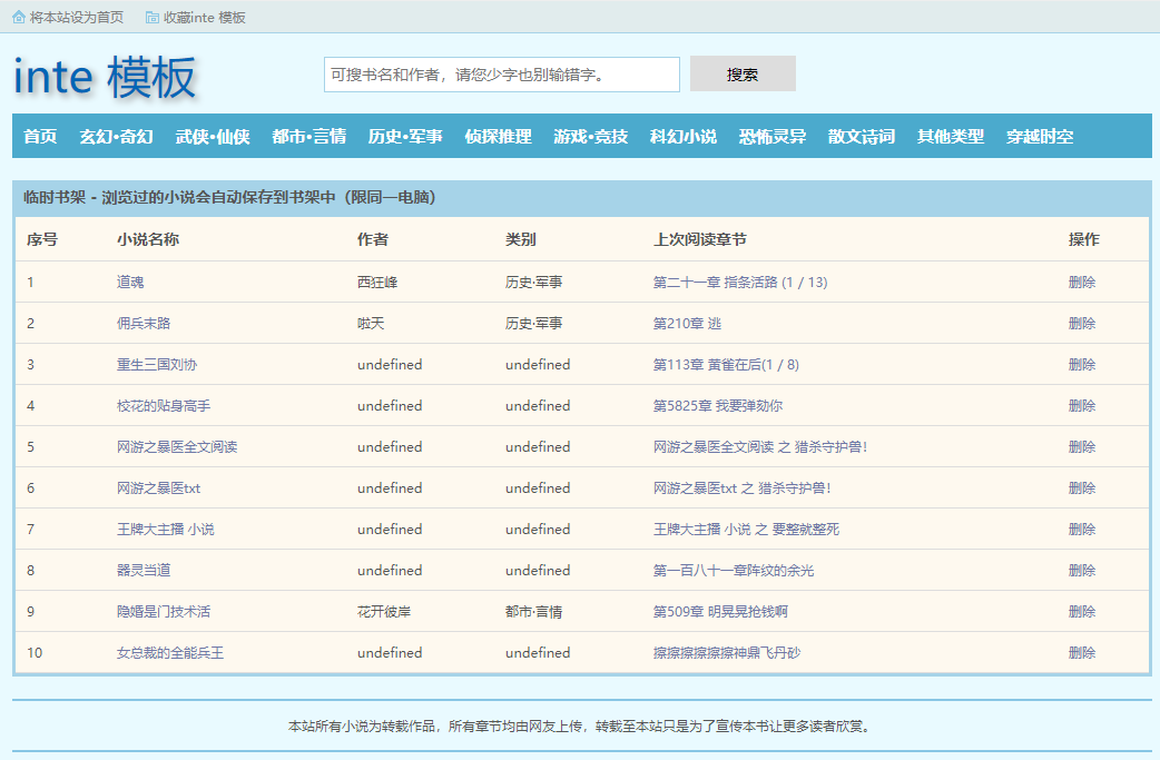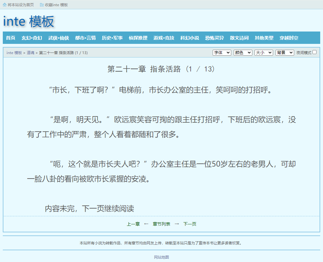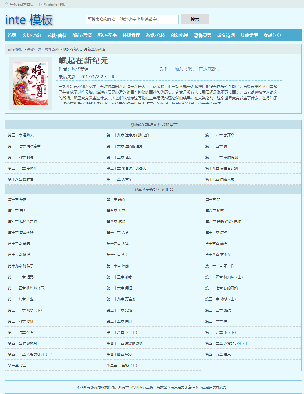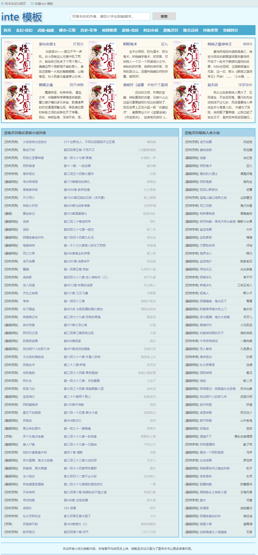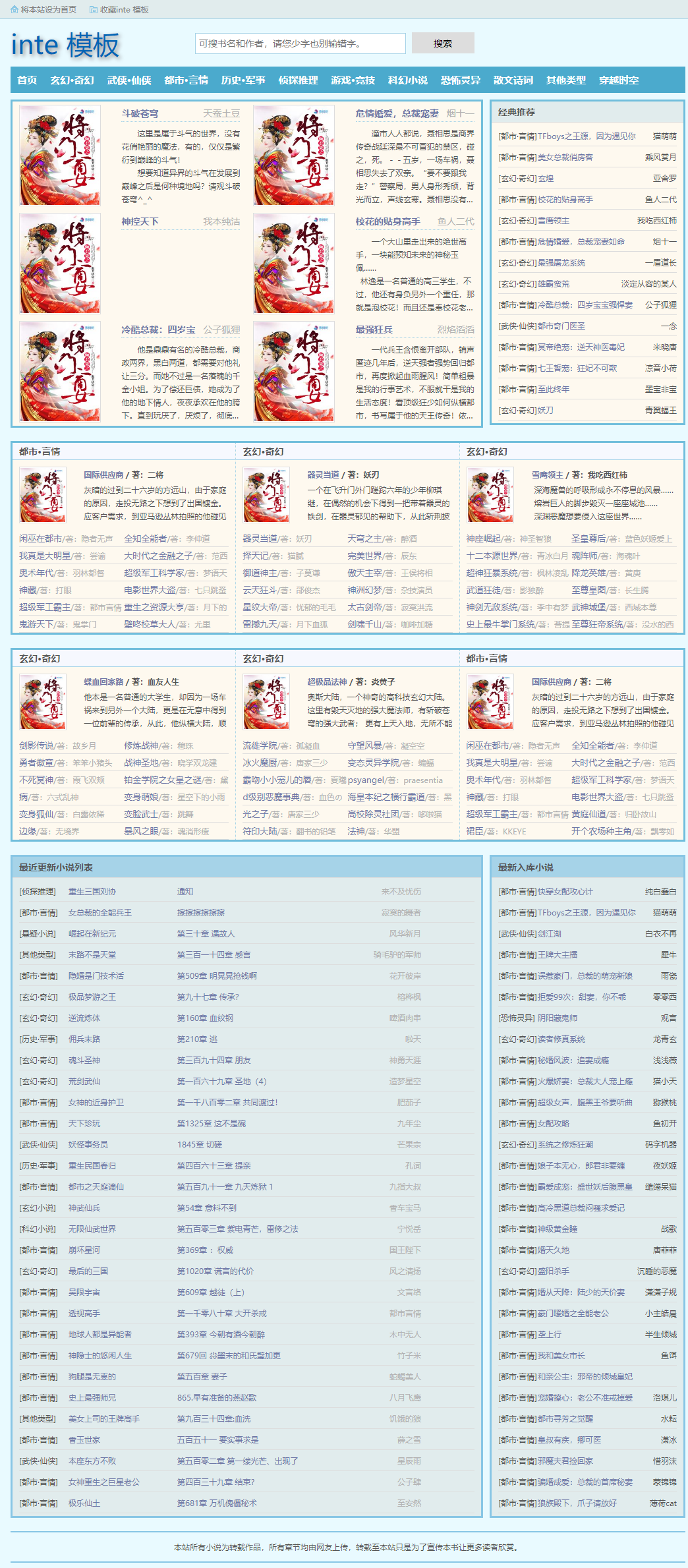 发 布 者: admin 适 用 终 端: 自适应 适配cms系统: 蓝海cms系统 演 示: 暂无演示 购 买 次 数: 0 发 布 时 间: 2021/8/17 2:59:50 价 格: 150.00 点击下载 立即购买 简介:此模板仿qu.la 蓝色经典配色,自适应,布局模仿笔趣阁板子,蓝海cms一键开启,内附使用说明 <仿qu.la自适应笔趣阁蓝色经典模板,小说模板下载>相关说明 本模板目前仅提供pc端样式截图 1、首页截图: 2、信息页截图: 3、内容页截图: 4、分类页截图: 5、阅读记录页截图: