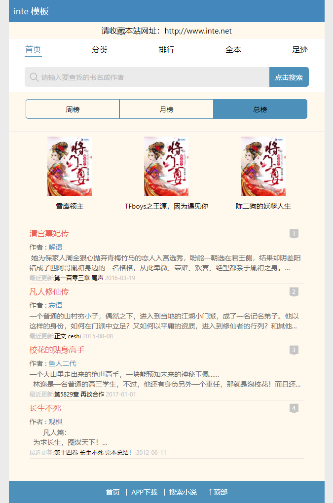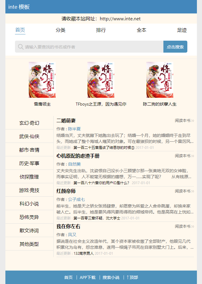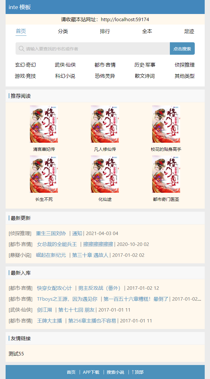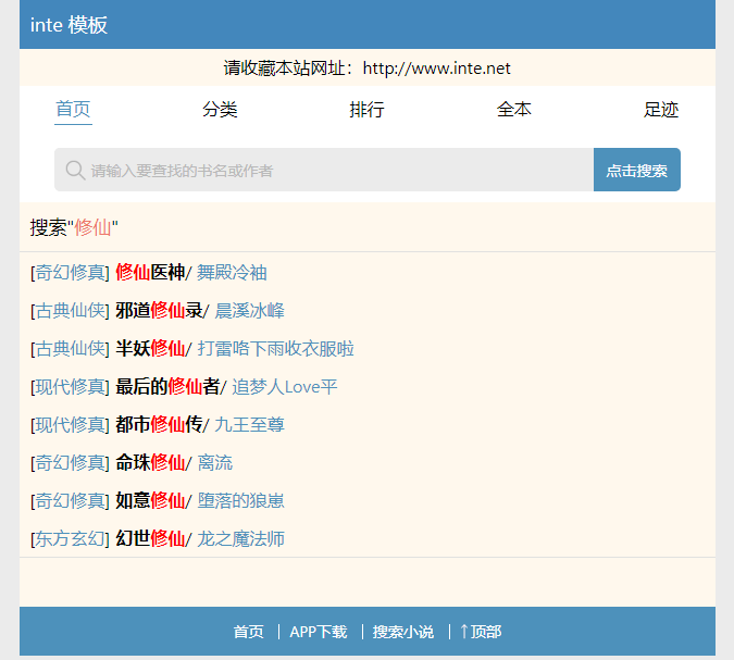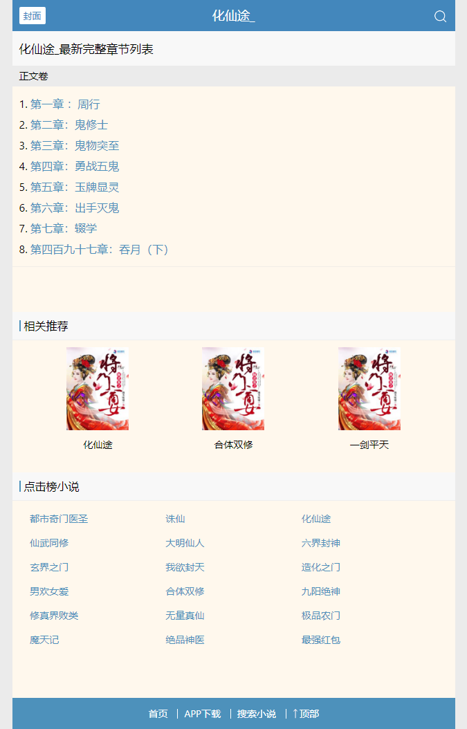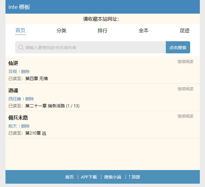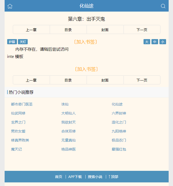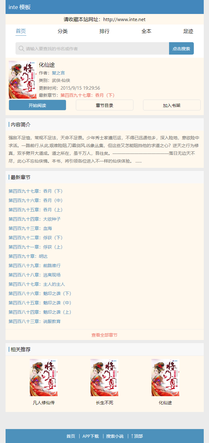 发 布 者: admin 适 用 终 端: 自适应 适配cms系统: 蓝海cms系统 演 示: 暂无演示 购 买 次 数: 0 发 布 时 间: 2021/8/17 2:51:14 价 格: 150.00 点击下载 立即购买 简介:此模板为模仿格格党站点制作,配色为浅蓝色,为自适应设计,pc和移动站点都适应,此模板仅支持蓝海cms小说系统使用,内附使用说明。 <仿格格党网站模板,自适应小说模板,蓝色经典配色,模板下载>相关说明 本模板目前仅提供pc端样式截图 1、首页截图: 2、信息页截图: 3、章节列表页截图: 4、内容页截图: 5、分类页截图: 6、阅读记录页截图: 7、搜索页截图: 8、排行榜页截图: