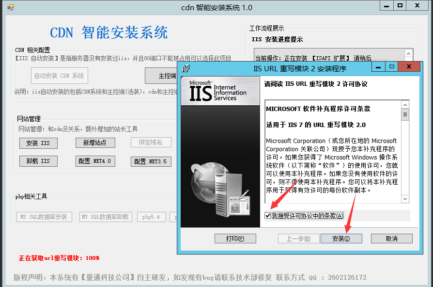 第六步:中间系统会检测有没有安装伪静态必须附加,如果没有安装系统会自动安装,此时需要用户点击接受授权和安装即可,如图所示: