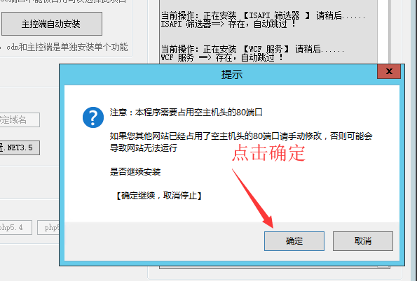第八步:程序会占用80端口,如需要https程序需要443端口的支持,请确定80端口没有被其他程序占用如没有占用点击【确定】即可,如图所示: