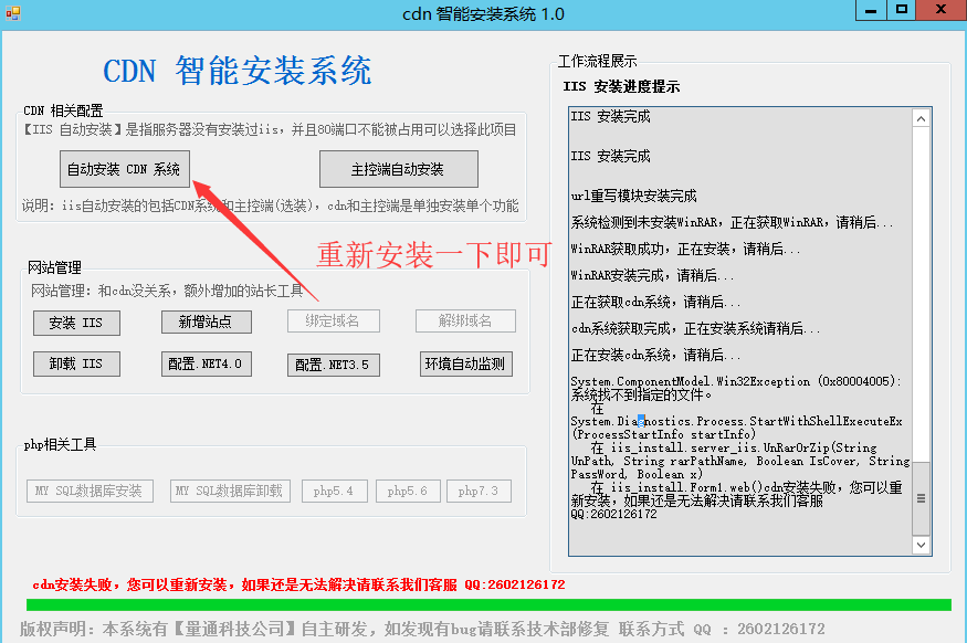 第十一步:完毕后就开始安装cdn系统,如果安装过程中出现错误提示安装失败,重新安装即可,如图所示: