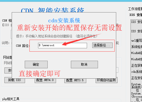第十二步:点击【自动安装cdn系统】按钮后会出现开始的cdn路径配置页面,一般会保留开始配置的信息(关闭软件重新打开的需要手动配置选择路径),如图所示: