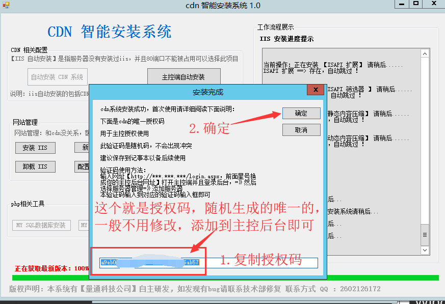 第十三步:确定后就开始自动安装cdn系统,此步骤操作大概一分钟即可完成,完成后会提示成功,并且下面会有授权码,可以吧授权码复制到记事本,或者直接到主控端进行配置关联,如图所示: