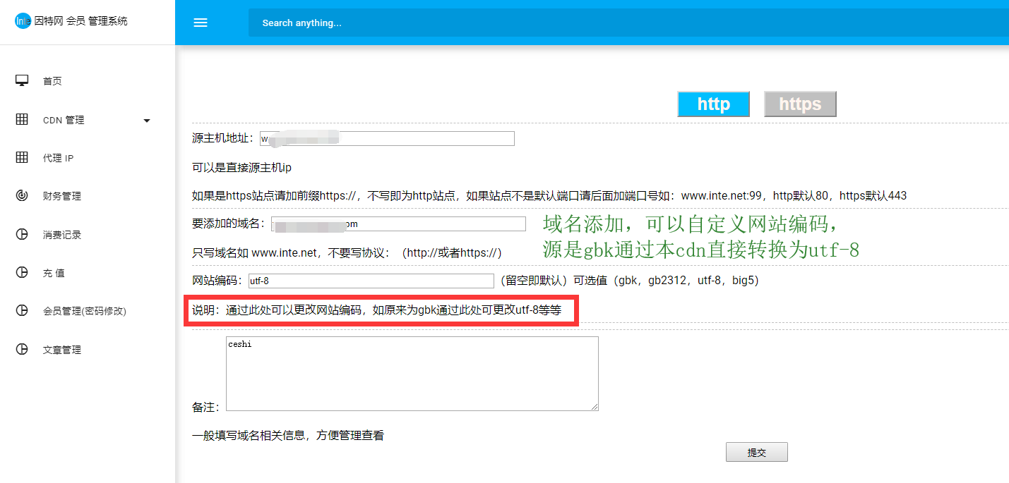第三:域名添加或者修改界面,新增了自动识别网站编码,同时可以通过cdn直接修改网站页面编码,如源为gbk,要修改为主流的utf-8就比较麻烦,通过cdn简单配置就可以实现这些功能