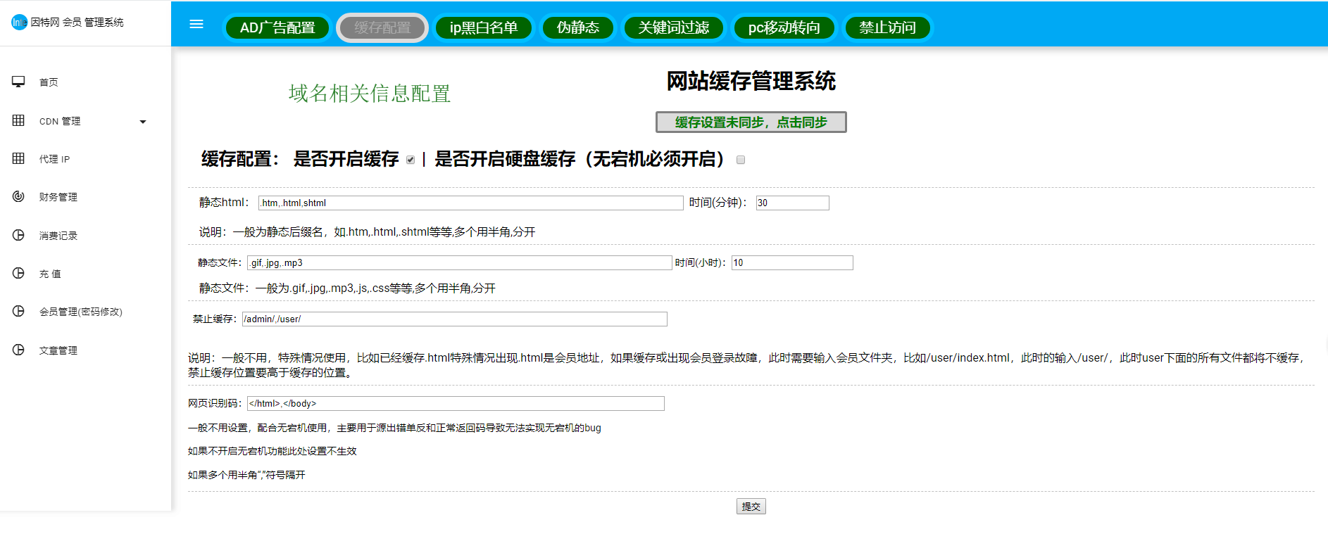 第四:域名相关管理,可以通过域名信息管理直接管理广告,缓存配置,ip黑白名单,伪静态(可以有效预防网站后门漏洞),关键词过滤,电脑端和移动端自动识别跳转,特殊地址禁止访问等等。