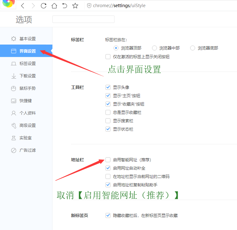 第三步:选择【界面设置】=》【取消启用智能网址推荐】