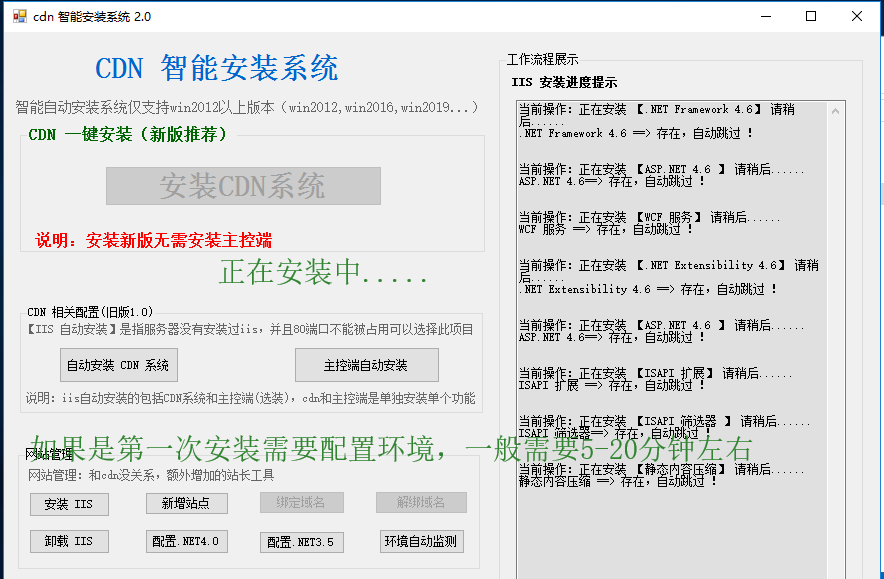 第五步:确定【开始安装】后系统就开始自动安装,如果没有配置过iis的系统会自动配置,这个过程需要大概5-20分钟不等,如果已经配置好并且系统检测到配置正常,此处安装1分钟即可完成,如果配置达不到要求系统会自动配置,需要一定时间,需要耐心等待