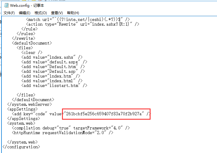 ②:打开后看到下面的一行就是授权码,每个授权码都不一样,比如我这里测试的是 261bcbf5e256c659407f83a70f2b927a