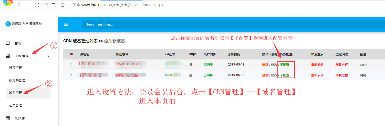 广告管理系统说明:就是为了根据实际情况开启关闭和对应限制广告的显示而设定的,这样用户只需要通过后台就可以随时开启和关闭广告而不用去进入服务器去修改代码这么麻烦广告管理系统使用规范:使用广告管理系统广告代码要用js的方式来调用,不然容易出现冲突怎么进入广告管理系统:登录官方网站 www.inte.net 登录会员,进入会员管理页面,然后点击左侧的【CDN管理】 》 【域名管理】,进入后点击顶部导航的【AD广告配置】如图: