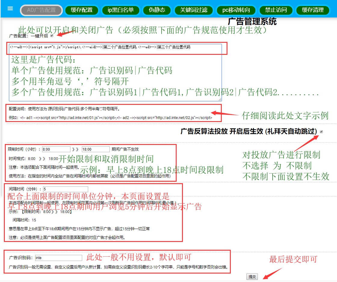 图片说明:点击顶部的【AD广告配置】进入上面图片页面①、一键开启:是对广告开启和关闭的开关,关闭后就不显示广告了,开启后广告显示正常,(注意:针对下面配置了广告的生效,否则不生效)②、广告代码的配置: 广告识别码:这里稍微有些麻烦,在你网站要防止广告代码的地方修改为广告识别码,比如 123456789 广告代码 aabbcc,那么就写成 123456789 广告识别码 aabbcc,这样通过cdn后你的广告识别码就自动更换成你正常广告代码了。 广告代码的设置:使用规范,广告识别码|广告代码,广告识别码2|广告代码2,这样就把上面你设置的广告识别码广告识别码自动转换成你正常的广告代码了,设置的时候注意格式③、广告显示管理开关:选择为开启广告现在,关闭后下面的限制不生效,(限制注意,设置礼拜的不生效)④、限制时间设置:前面为开始时间,后面为结束时间,在两个时间段进行广告的时间限制,比如:开始为8:00 结束为18:00,意思就是早上的8点开始到晚上的18点时间段,间隔一定时间广告开始正常投放【时间间隔设定的时间】,否则不显示广告⑤、间隔时间:这里设置单位为分钟,只能位数字,意思就是配合 ④步骤 的限制时间段内的间隔时间开始正常显示广告的⑥、广告识别吗:这里一般默认即可,无需设置 ⑦、检查设置无误后提交即可