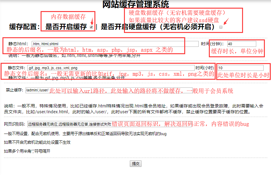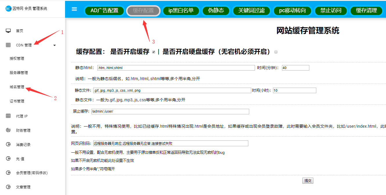 禁止缓存:此处设置可以输入会员系统路径,包含此路径的都不做任何缓存,常用于会员系统,因为会员系统不能做缓存,否则会员将会出现异常