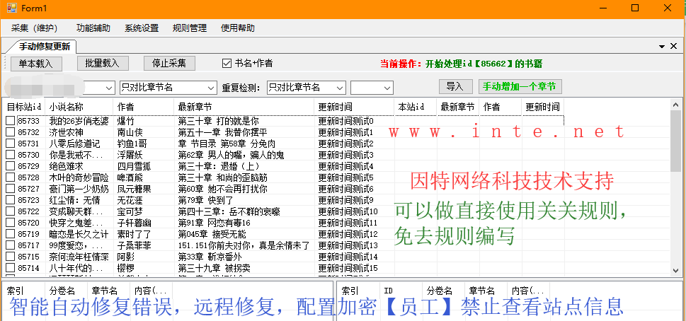 闲来无事做了一个关关采集器大补贴,主要针对站点内部数据错误,本软件可以自动修复修改并且更新站点数据,真正的解放双手,近期上线,需要的可以关注收藏本站 www.inte.net