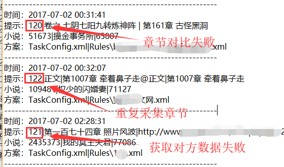 通过第一步操作会打开一个文本,一般错误为120(章节对比失败),121(获取对方数据失败),122(出现章节重复采集)如图所示
