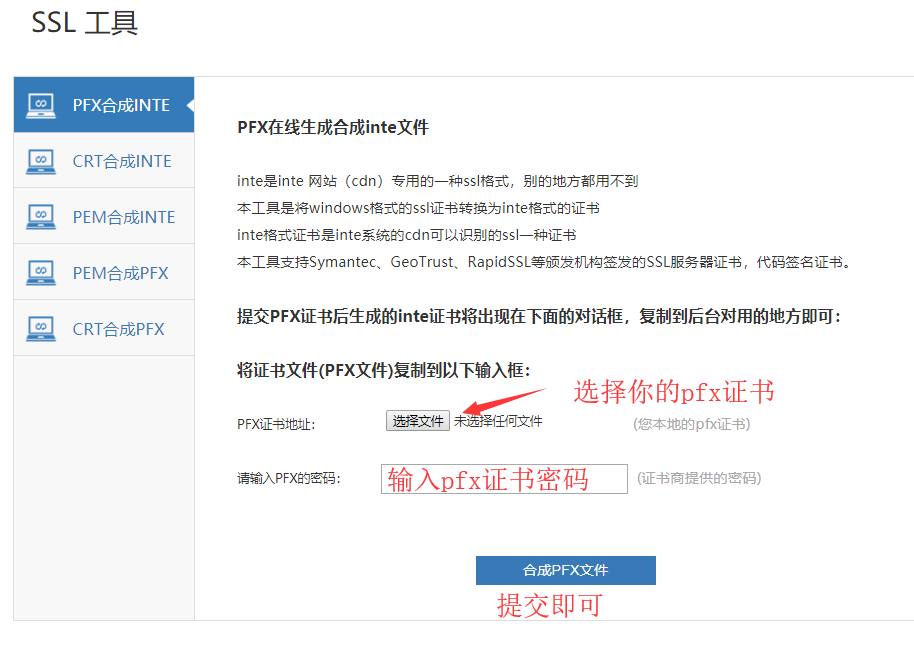 第四:根据你的证书个性选择对应的证书转换,一般为crt + key 和pem + key 还有pfx + 密码,推荐pfx+密码的方式(这种方式比较简单),如果域名商没提供可以使用前者两种的任意一种